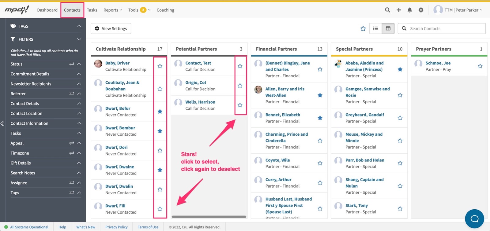 To find the Stars feature for Contacts, visit the Contacts tab in MPDX.